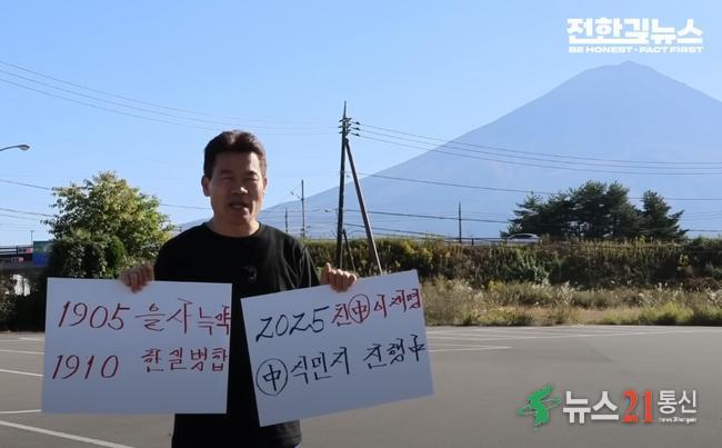 지난 17일 일본 후지산이 보이는 곳에서 ‘1905 을사늑약 1910 한일병합’, ‘2025 친중 이재명 중 식민지 진행 중’이라고 적힌 손팻말을 들고 촬영한 영상을 게시한 극우 유튜버 전한길 씨가 최근 일본에 체류한 뒤 호주로 향한 것으로 확인됐다.