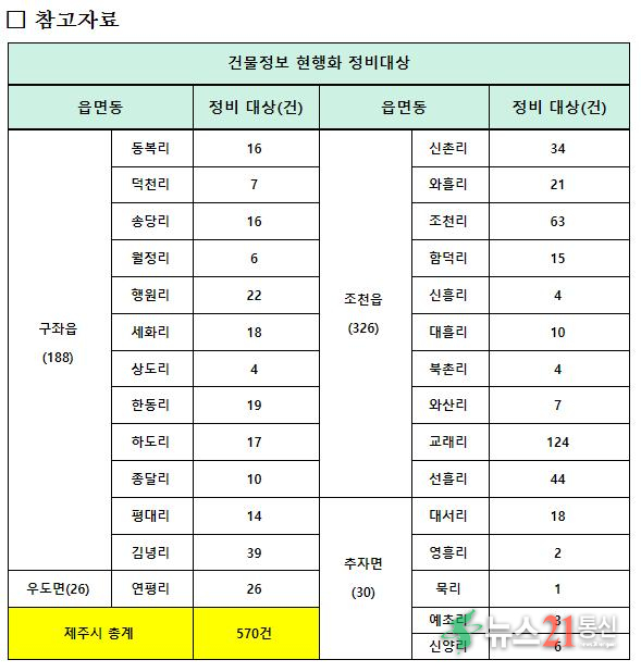 이번 사업은 도로명주소가 부여되어 있음에도 건축물대장에 지번 주소만 기재된 건축물에 도로명주소를 추가 기재하는 내용으로, 제주시 읍·면 지역 570건(읍 514건, 면 56건)이 대상이었다.