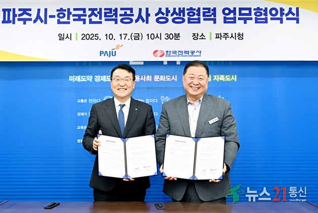 [뉴스21 통신=추현욱]파주시와 한국전력공사는 지난 17일, 대규모 개발사업의 성공적인 추진과 안정적인 전력 공급을 위한 상생 협력 업무협약을 체결했다고 밝혔다.