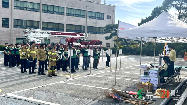 이번 훈련은 청사 내 방화 및 테러 발생 상황을 가정해 진행된 실전 대응훈련으로, ▲직원 대피 ▲초기 화재 진압 ▲인명 구조 ▲테러범 제압 ▲현장 복구 등 전 과정을 실제 상황처럼 재현했다.