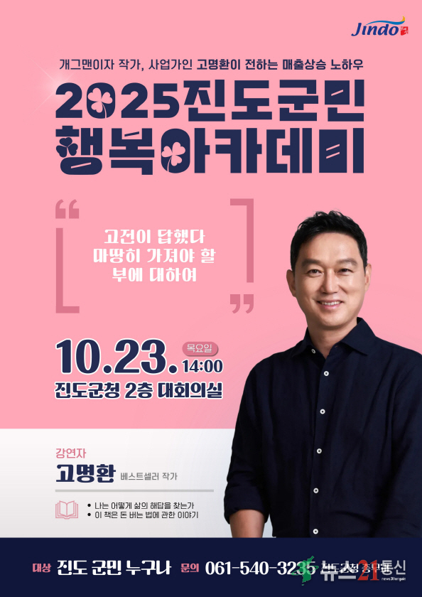 [뉴스21 통신=박철희 ]진도군(군수 김희수)은 오는 10월 23일(목) 오후 2시, 진도군청 대회의실에서 개그맨 출신 작가 고명환 씨를 초청해 ‘진도 군민행복 아카데미’ 강연을 개최한다고 밝혔다.