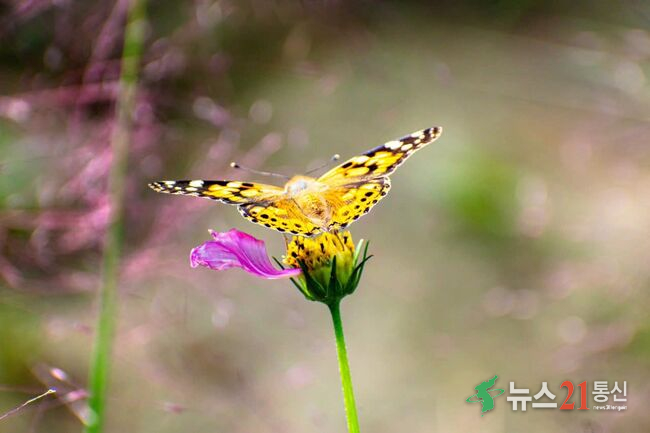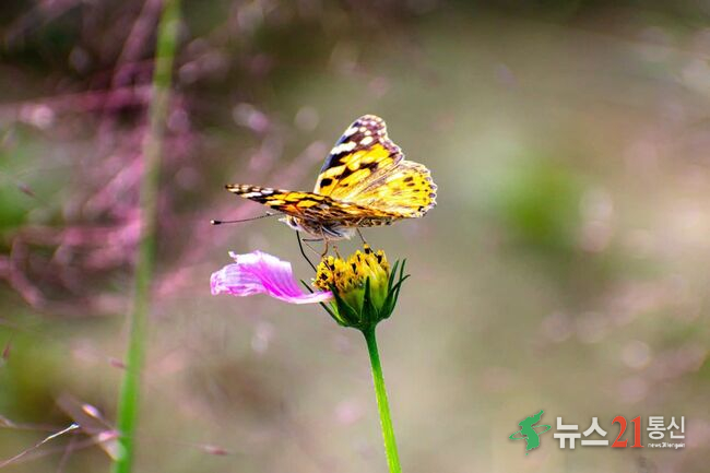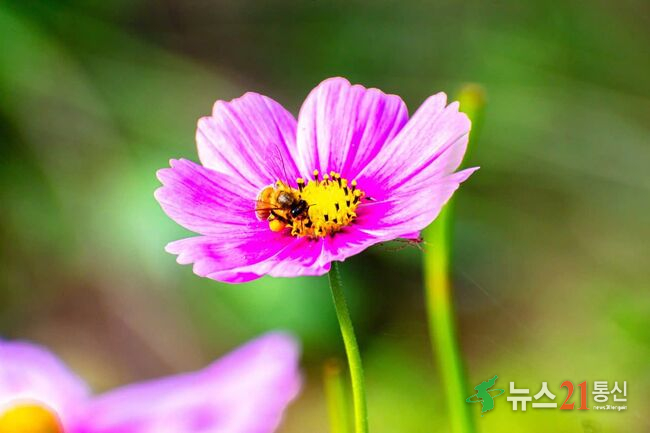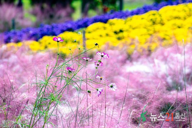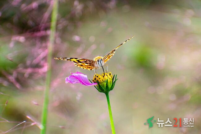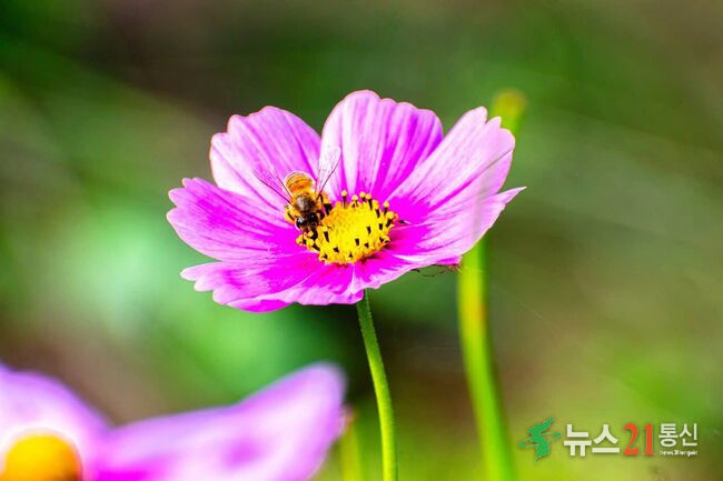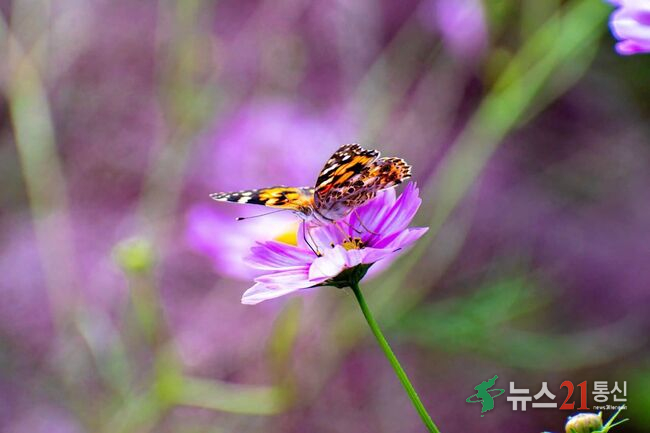 코스모스는 가을을 대표하는 꽃으로, 청초하면서도 밝은 색감으로 많은 사람들의 사랑을 받는다. 가느다란 줄기 위에 핀 꽃잎은 바람이 불면 부드럽게 흔들리며 계절의 정취를 한껏 더한다. 이름은 그리스어로 ‘질서’나 ‘조화’를 뜻하는 ‘코스모스(cosmos)’에서 유래했는데, 꽃잎의 균형 잡힌 형태가 자연의 조화를 상징한다고 전해진다. 주로 분홍, 흰색, 자주색 등의 색을 띠며 들판이나 길가에서도 쉽게 볼 수 있다. 가을 하늘 아래 피어난 코스모스는 계절의 끝자락을 알리며, 그 흔들림 속에 덧없고도 아름다운 자연의 순환을 느끼게 한다.