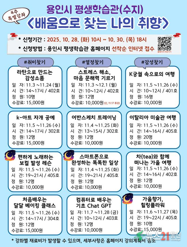 접수는 용인시 평생학습관 홈페이지에서 온라인으로 진행되며, 수강료는 강좌별로 1만~1만5000원이다. 재료비는 별도 부담이다.