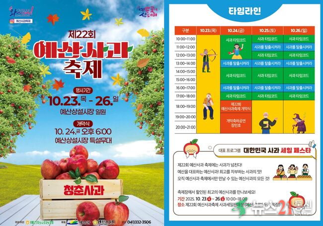 예산군은 10월 23일부터 26일까지 4일 동안 예산상설시장 일원에서 ‘청춘사과’를 주제로 ‘제22회 예산사과축제’를 개최한다고