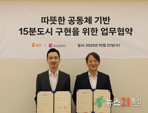 부산시(시장 박형준)는 22일 오후 2시 10분, 서울 서초구 ㈜당근마켓 본사에서 ‘따뜻한 공동체 기반 15분도시 구현을 위한 업무협약’을 체결했다고 밝혔다.