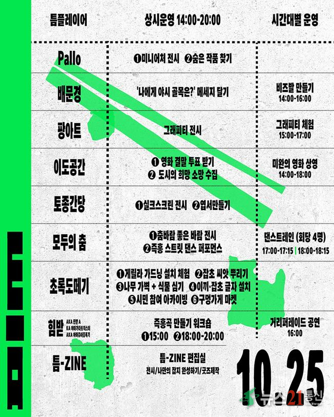 대구광역시는 오는 10월 25일(토)부터 26일(일)까지 이틀간 동성로 야시골목 일대에서 ‘동성로 르네상스 프로젝트’의 일환으로 ‘틈-플레이그라운드’ 팝업 행사를 개최한다.