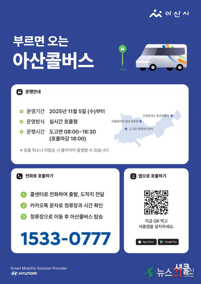 아산시(시장 오세현)가 도고면 지역의 관광 활성화와 주민들의 이동 편의성 제고를 위해 오는 11월 5일부터 수요응답형 공공형 버스(DRT) ‘아산콜버스’를 시범 운행한다.