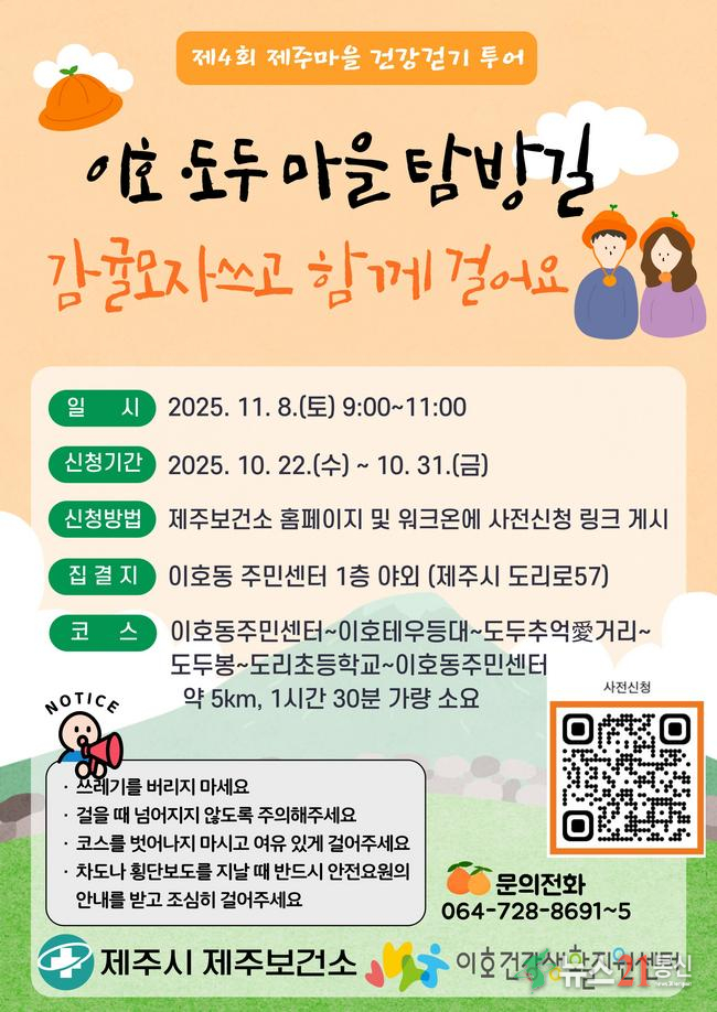 제주 이호건강생활지원센터는 고향사랑기금 지정기부 사업의 일환으로 도민과 관광객이 함께하는 ‘제주마을 건강 걷기 투어–이호·도두 마을 탐방길’ 행사를 오는 11월 8일(토) 개최한다고 밝혔다.