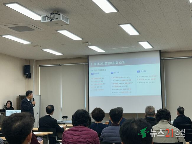 이날 교육에는 온양3동 주민자치회 회원 33명이 참석했으며, 김영배 도 자치경찰위원회 사무국장이 강사로 나서 자치경찰제도의 도입 배경과 역할, 성과를 설명하고 시민 참여 방안과 주요 치안 사무를 소개했다.