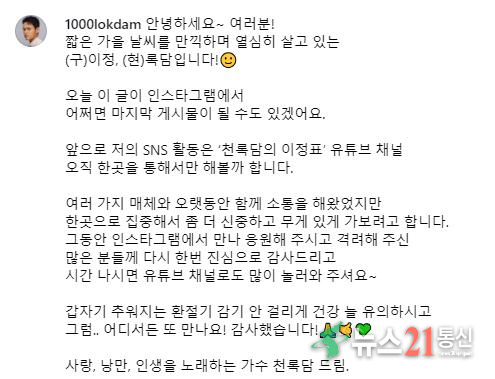 가수 천록담(본명 이정)이 팬들에게 마지막 인사를 전하며 인스타그램 활동을 마무리했다.