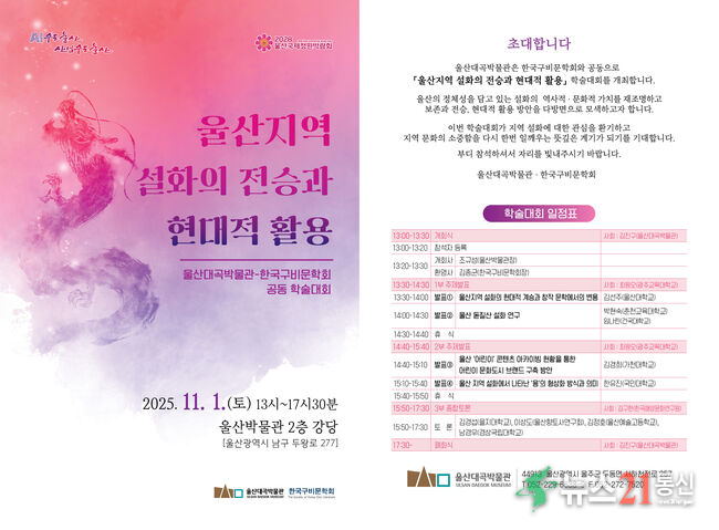 박물관 관계자는 “이번 학술대회는 연구자뿐 아니라 울산 설화에 관심 있는 시민이라면 누구나 무료로 참여할 수 있다”라며 “울산의 정체성을 담고 있는 설화 연구 성과를 함께 공유하는 뜻깊은 자리가 되길 바란다”라고 말했다.