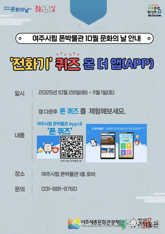 여주세종문화관광재단(이사장 이순열)은 10월 ‘문화의 날’을 맞아 여주시립 폰박물관에서 모바일 앱을 활용한 체험형 퀴즈 프로그램 ‘전화기 퀴즈 온 더 앱’을 운영한다고 밝혔다.