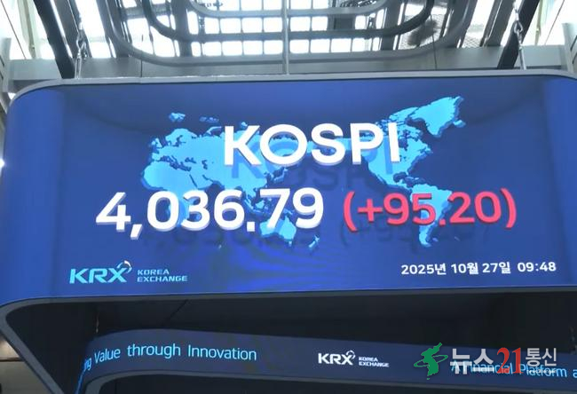 코스피가 27일 오전 상승 출발하며 사상 처음으로 4,000선을 돌파했다.