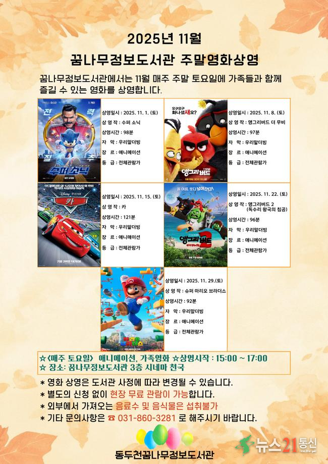 동두천시 도서문화사업소 꿈나무정보도서관은 오는 11월 매주 토요일, 어린이와 가족을 대상으로 애니메이션 및 가족영화 5편을 상영한다고 밝혔다.