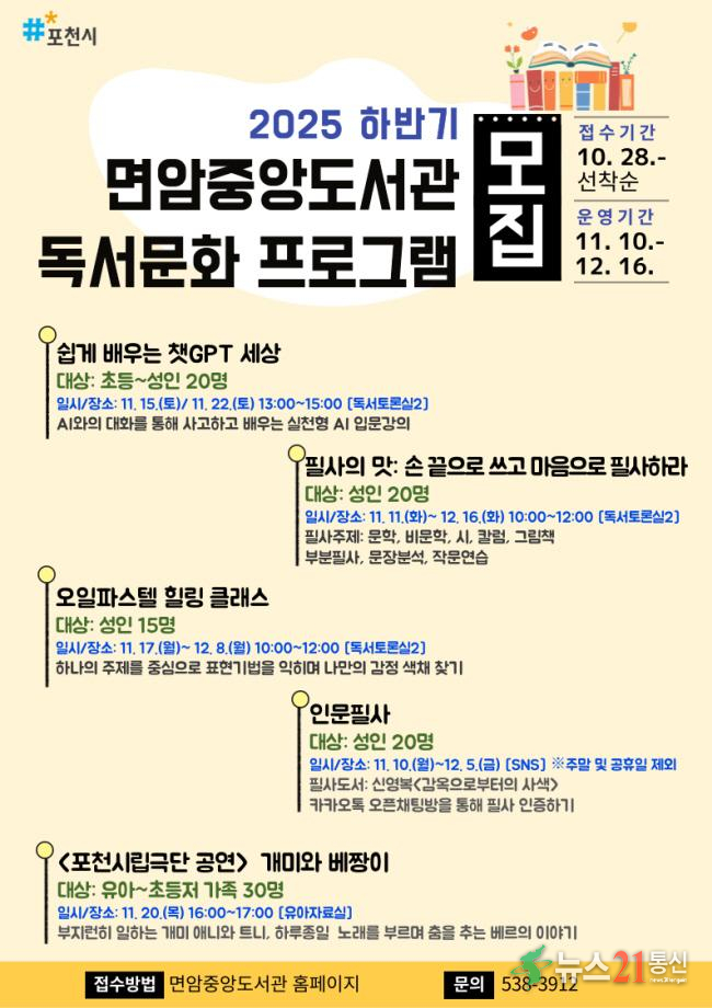 포천시(시장 백영현) 면암중앙도서관은 오는 11월 16일부터 하반기 독서문화프로그램을 운영한다. 이번 프로그램은 시민들의 독서 흥미를 높이고, 다양한 세대가 함께 참여할 수 있도록 아동 및 성인을 대상으로 총 5개 강좌로 구성됐다.