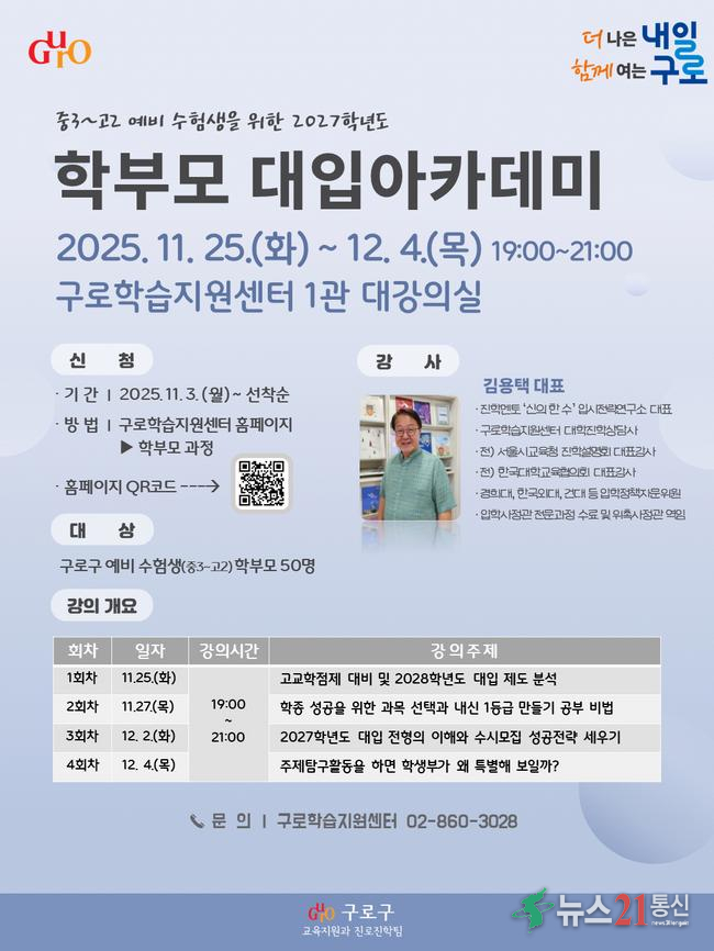 참여를 원하는 학부모는 11월 3일부터 구로학습지원센터 누리집에서 회차별로 선착순 50명을 모집하며, 수강료는 무료다.
