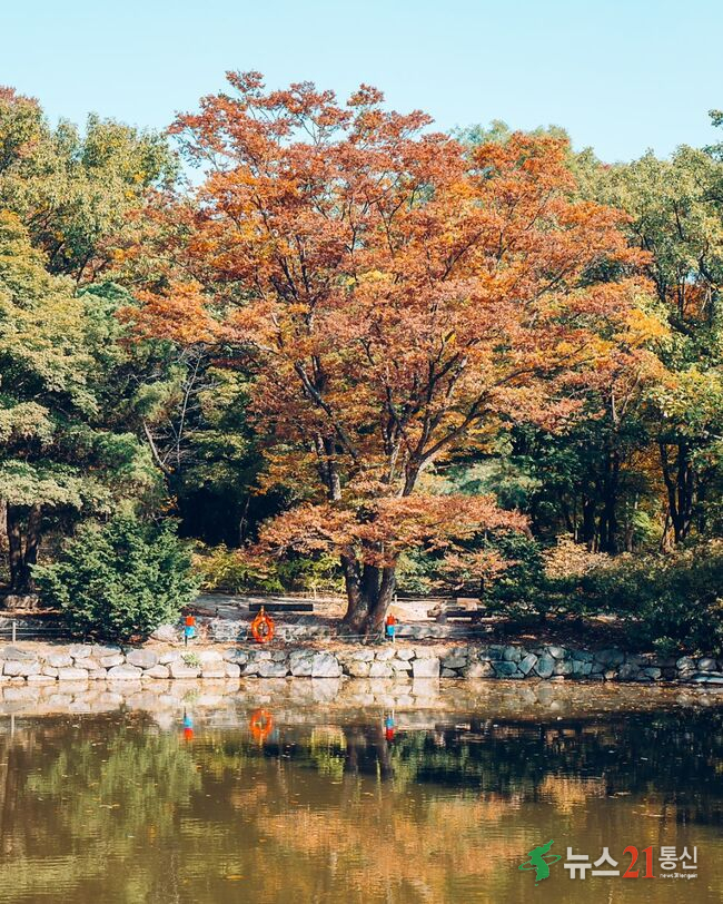 창경궁에는 춘당지라는 전통 연못을 볼 수 있다. 이렇게 전통적으로 만든 연못이나 호수에는 중앙에 인공적으로 작은 섬을 하나 만들어 둔다고 한다. 가을이 되면 인공 섬의 일부가 붉게 물들어 주변의 초록색 소나무와 대비되는 모습을 담을 수 있고 이 인공 섬은 창경궁에 날아온 새들의 쉼터로, 종종 새들도 관찰할 수 있기 때문에 창경궁에 방문하시는 분들께 꼭 추천드리는 스팟 중 하나이다.