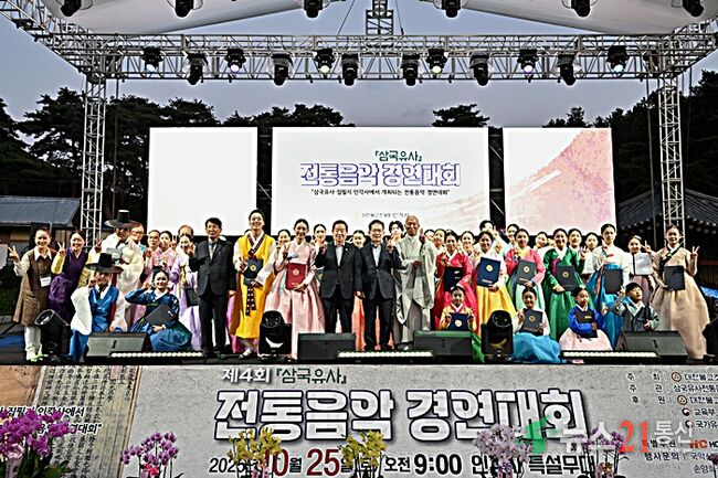 지난 25일, 군위군 인각사에서 열린 ‘제4회 전통음악 경연대회’와 ‘한마당 음악회’가 성황리에 마무리됐다. 이날 행사에는 군위군수, 주호영 국회부의장, 강대식 국회의원, 인각사 호암 스님을 비롯한 군민 500여 명이 참석하여 삼국유사의 문화적 의미를 되새기는 시간을 가졌다.