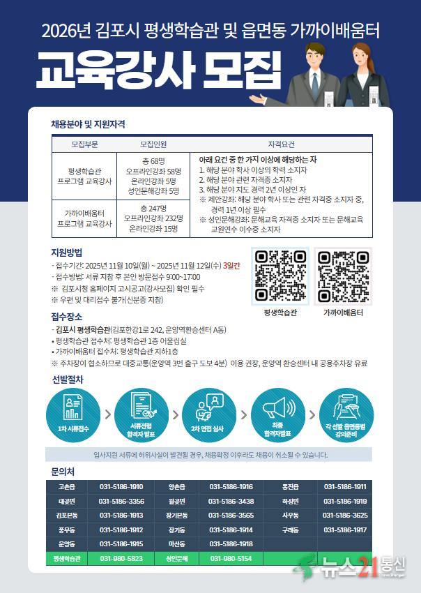 김포시는 시민의 평생학습 참여 확대와 다양한 학습 수요 충족을 위해 2026년도 평생학습 프로그램 강사를 공개 모집한다고 밝혔다.