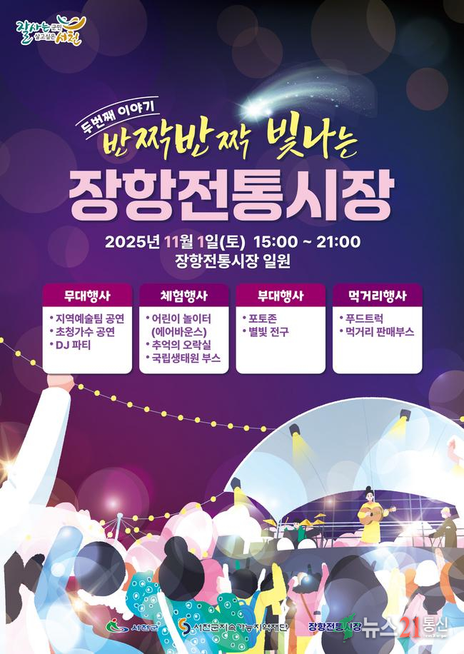 서천군지속가능지역재단 상권활성화센터는 오는 11월 1일 오후 3시부터 밤 9시까지 장항전통시장에서 ‘반짝반짝 빛나는 장항전통시장 두 번째 이야기’ 오감만족 행사를 개최한다고 밝혔다.