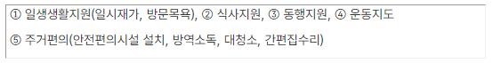 '제주가치돌봄'은 돌봄이 필요한 누구나 이용할 수 있는 돌봄 서비스로, 생활돌봄 및 주거편의 총 5대 9종*의 서비스를 맞춤형으로 지원하고 있다.