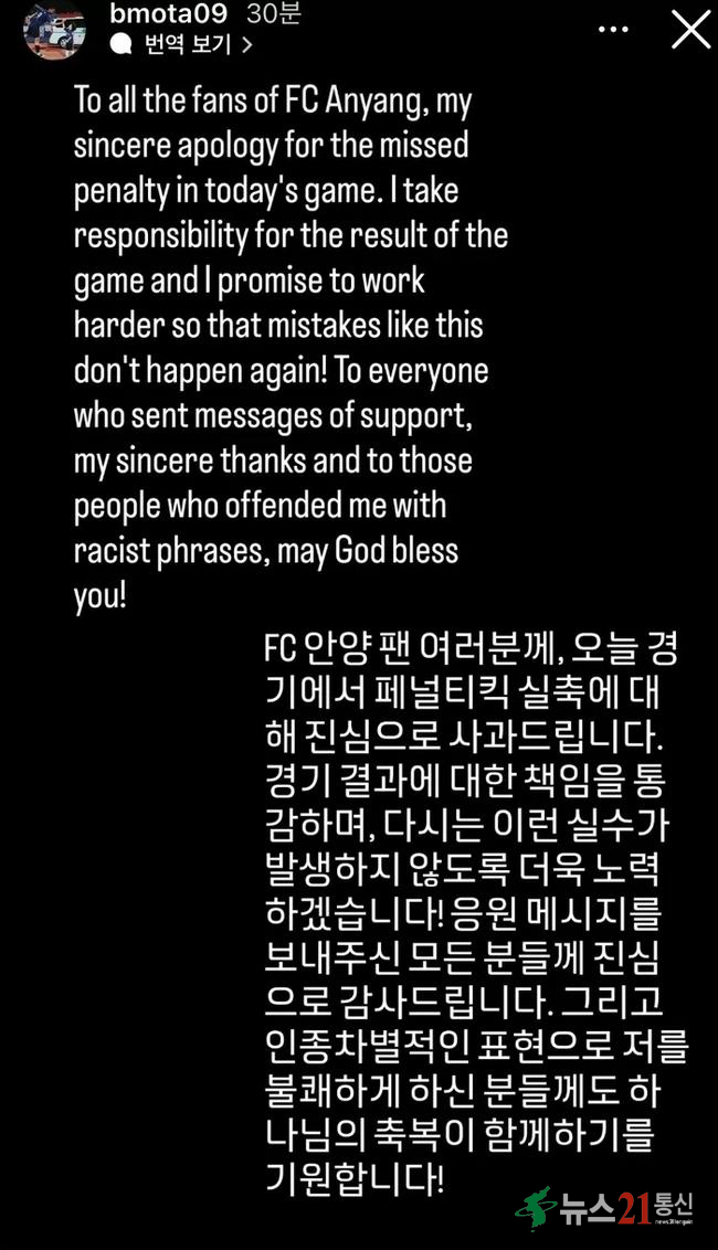 실제로 경기 직후 일부 이용자들은 모따의 SNS에 인종 비하와 조롱이 섞인 댓글을 남겼다. 이에 모따는 자신의 인스타그램을 통해 “페널티킥 실축을 진심으로 사과드린다”며 “인종차별적인 표현으로 저를 불쾌하게 하신 분들께도 하나님의 축복이 함께하기를 기원한다”는 메시지를 남겼다. 담담한 문장 뒤에는 깊은 상처가 묻어 있었다.