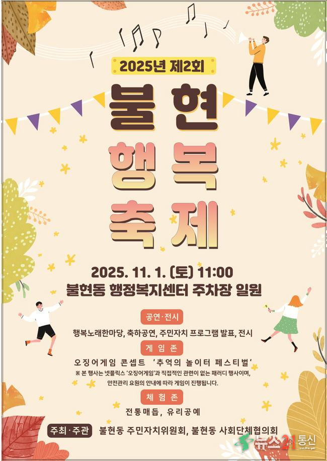 불현동 주민자치위원회(위원장 박순호)는 오는 11월 1일(토) 불현동 행정복지센터 주차장 및 인근 도로 일원에서 제2회 불현행복축제를 개최한다고 밝혔다.