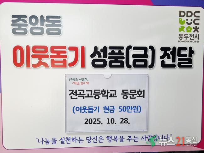 동두천시청 전곡고등학교 동문회(회장 최현규 세무과장)는 지난 28일, 지역 내 어려운 이웃을 돕기 위해 성금 50만 원을 중앙동 행정복지센터에 기탁했다.