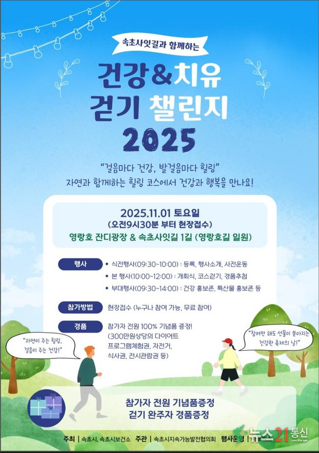 속초시는 속초시지속가능발전협의회와 함께 오는 11월 1일(토) 영랑호 잔디광장과 속초 사잇길 일원에서 ‘속초 사잇길과 함께하는 건강&치유 걷기 챌린지 2025’를 개최한다.