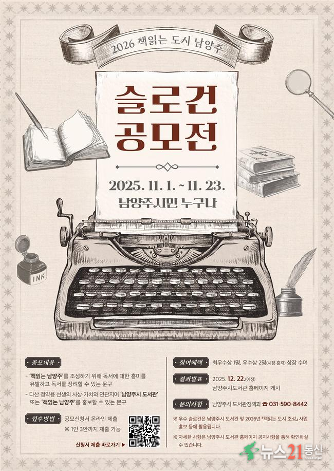 남양주시(시장 주광덕)는 11월 1일부터 23일까지‘2026 책읽는 도시 남양주 슬로건 공모전’을 개최한다고 밝혔다.
