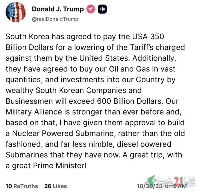 도널드 트럼프 미국 대통령이 자신의 소셜미디어 플랫폼 ‘트루스소셜(Truth Social)’에 한국 대통령을 ‘총리(Prime Minister)’로 잘못 표기했다가 수정했다.