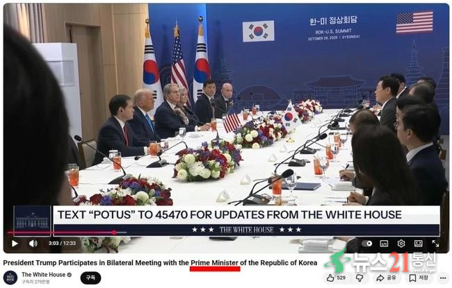사진=영상 제목에 ‘트럼프 대통령, 대한민국 국무총리(Prime Minister)와의 양자 회담 참석’이라고 적혀 있다. 다만 현재는 제목을 ‘대통령’(President)으로 수정한 영상이 전체 생중계 목록에 노출 중이다. 백악관 유튜브