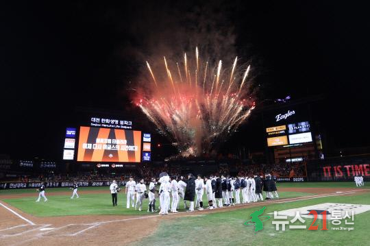 경기 종료와 동시에 대전 하늘에는 불꽃이 터졌다. 김승연 한화 회장이 경기 결과와 관계없이 팬들에게 감사의 뜻을 전하기 위해 미리 준비한 이벤트였지만, 극적인 승리와 맞물리며 진짜 ‘승리의 축포’로 빛났다.