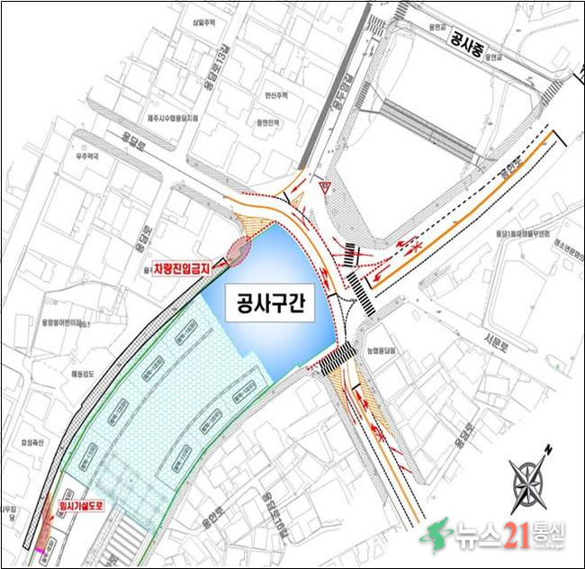 제주시는 ‘한천 자연재해위험개선지구 정비사업’의 일환으로 추진 중인 제2한천교 재가설 공사에 따라, 오는 11월 11일부터 용담로 일부 구간의 도로 차선을 축소 운영한다고 밝혔다.