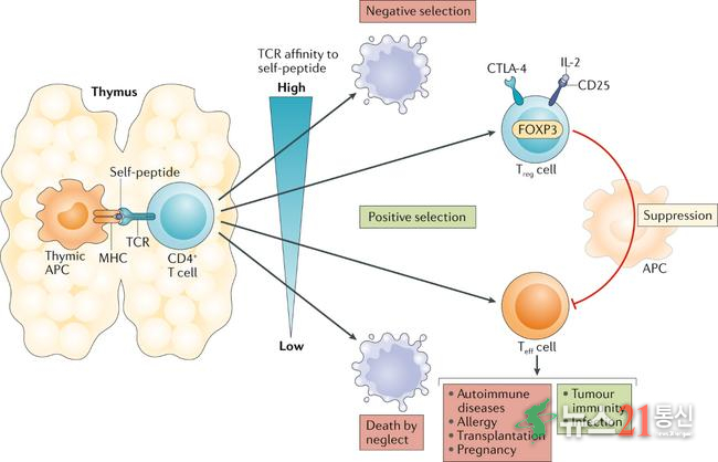 "조절 T세포(Treg)의 형성 과정. 흉선(Thymus)에서 자기 항원에 대한 친화도가 높은 T세포는 조절 T세포로 분화되어 면역 억제 기능을 수행한다. 이 세포들이 암세포 주변에서 과도하게 활성화되면 면역 시스템이 암을 공격하지 못하게 된다."