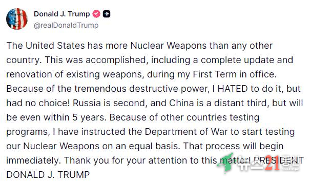 트럼프 대통령은 30일 자신의 소셜미디어에 “미국은 즉시 핵무기 시험을 시작할 것”이라며 “러시아가 2위, 중국이 한참 뒤처져 있지만 5년 안에 따라잡을 것”이라고 밝혔다. 이어 “다른 나라들이 핵실험을 하고 있으니 우리도 동등한 조건에서 시험해야 한다”고 덧붙였다. 미국이 공식적으로 핵실험을 언급한 것은 1992년 이후 처음이다.