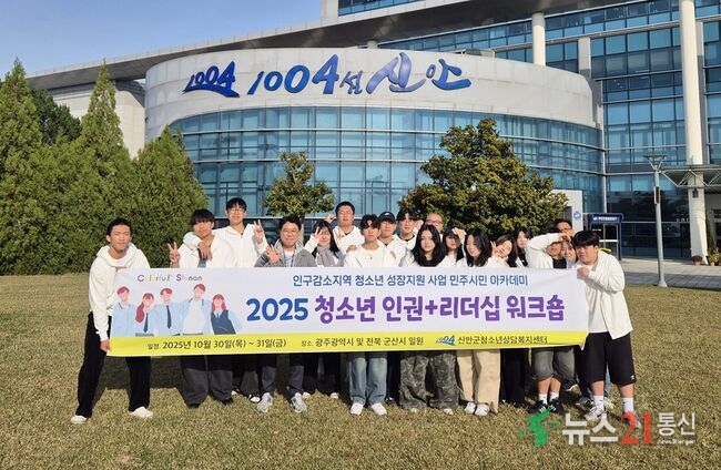 [뉴스21 통신=박민창 ] 신안군이 청소년들의 인권 감수성과 민주시민 의식을 높이기 위한 체험형 교육 프로그램을 성공적으로 마무리했다.신안군은 지난 10월 30일부터 31일까지 1박 2일간 광주광역시와 군산시 일원에서 ‘2025 신안군 청소년 인권+리더십 워크숍’을 개최했다고 밝혔다. 이번 행사는 신안군 청소년상담복지센터와 인권..