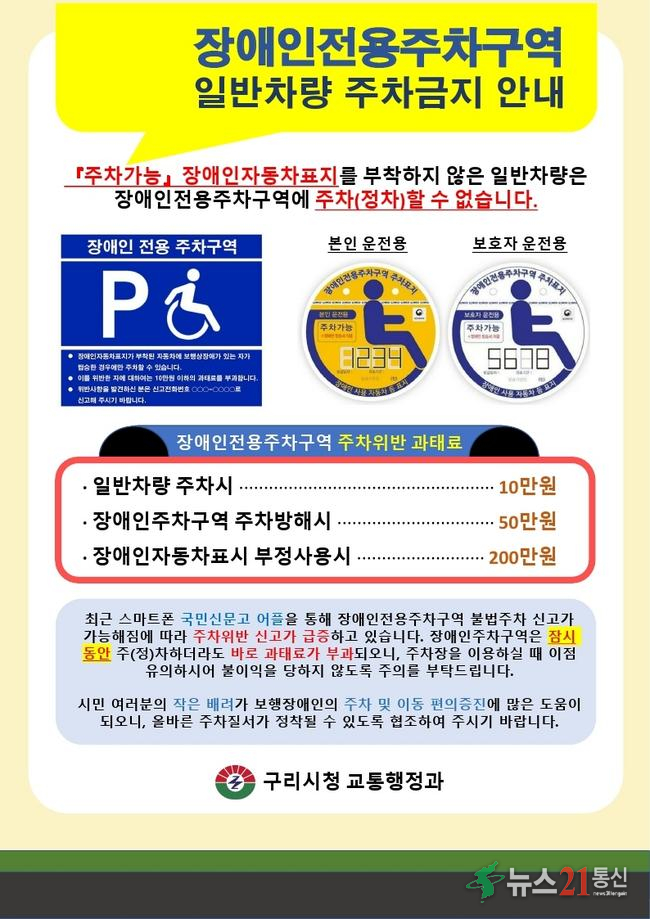 구리시 관계자는 “장애인전용주차구역은 단순한 주차 공간이 아닌 장애인과 이동 약자의 이동권을 보장하는 배려의 공간”이라며, “시민 모두가 관심을 가지고 올바른 이용 문화가 정착될 수 있도록 지속적으로 노력하겠다.”라고 밝혔다.