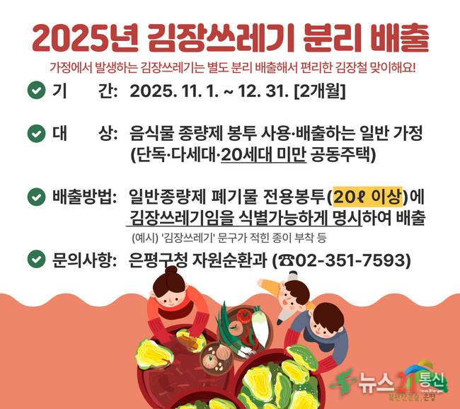 서울 은평구(구청장 김미경)는 김장철을 맞아 11월 1일부터 12월 31일까지 관내 일반가정에서 발생하는 김장쓰레기를 20L 이상 일반 종량제 폐기물 봉투에 담아 배출할 수 있도록 일시 허용한다고 밝혔다.