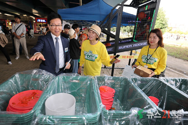 광산뮤직ON페스티벌 다회용기 점검 사진[뉴스21통신/장병기] 광주 광산구(구청장 박병규)가 축제장 내 다회용기 사용을 전면 도입해 일회용품 없는 친환경 가을 축제를 진행하고 있다.