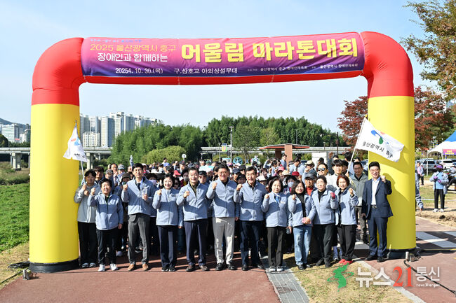 중구장애인체육회(회장 김영길)가 30일 구 삼호교 야외상설무대에서 2025 중구 장애인 어울림 마라톤 대회를 열었다. 이날 행사에는 김영길 중구청장과 박경흠 중구의회 의장, 시·구의원, 명일식 중구체육회 회장, 최진구 울산시 장애인체육회 사무처장, 장애인, 자원봉사자 등 300여 명이 함께했다.