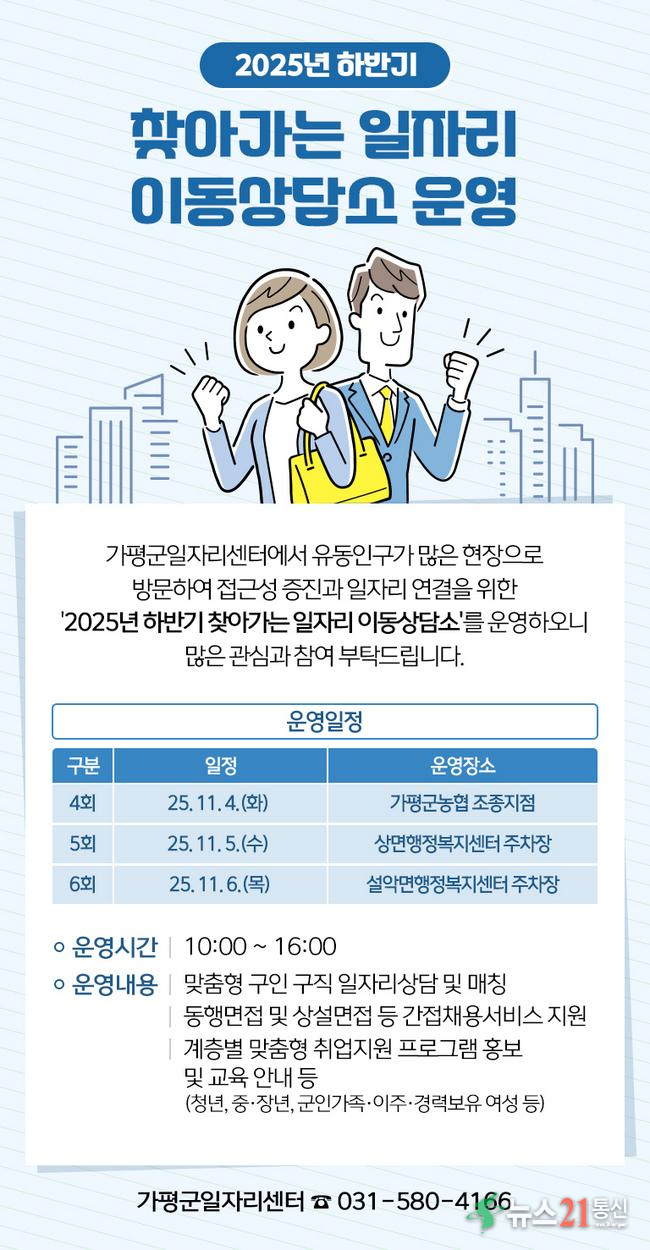 가평군은 오는 11월 4일부터 6일까지 ‘2025년 하반기 찾아가는 일자리 이동상담소’를 운영해 구인‧구직자 간 맞춤형 취업 연계를 강화한다고 31일 밝혔다.