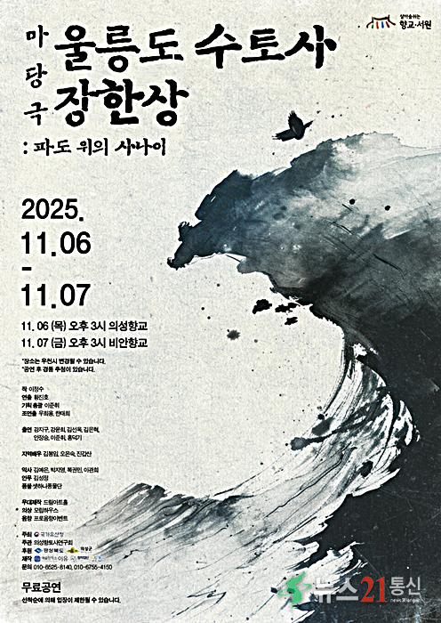 의성군(군수 김주수)은 국가유산청·경상북도·의성군이 주최하고 의성향토사연구회가 주관하는 마당극 「울릉도 수토사 장한상: 파도 위의 사나이」가 오는 11월 6일(수) 오후 3시 의성향교와 11월 7일(목) 오후 3시 비안향교에서 각각 개최된다고 밝혔다.