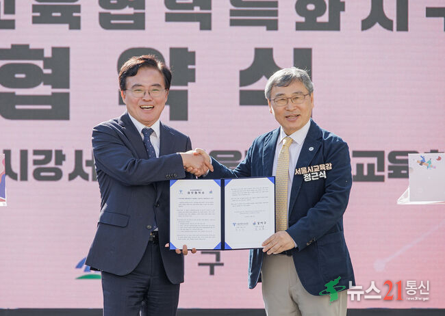 강서구, 진교훈 구청장(왼쪽)이 마곡광장에서 정근식 서울시교육감과 ‘교육협력특화지구 업무협약’을 체결하고 기념 촬영을 하고 있다.