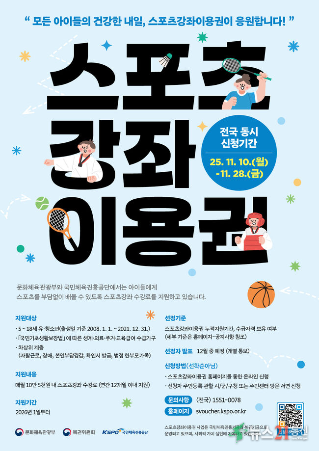 제주시는 체육복지 사각지대 해소와 균등한 스포츠 참여기회 제공을 위해 ‘2026년 저소득층 유·청소년 및 장애인 스포츠강좌이용권’ 대상자를 11월 10일부터 11월 28일까지 모집한다.