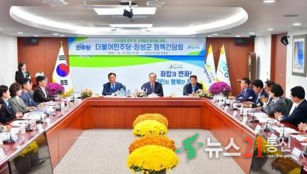 장성군과 더불어민주당이 31일 군청 상황실에서 정책간담회를 가졌다. 김한종 장성군수, 지역구 이개호 국회의원, 이영규 국회 정무실장, 심민섭 장성군의회 의장, 도·군의원, 당직자, 간부 공무원 등 80여 명이 참석해 군정 현안과 국가사업의 연계 방안에 대해 심도 있게 의견을 나눴다.