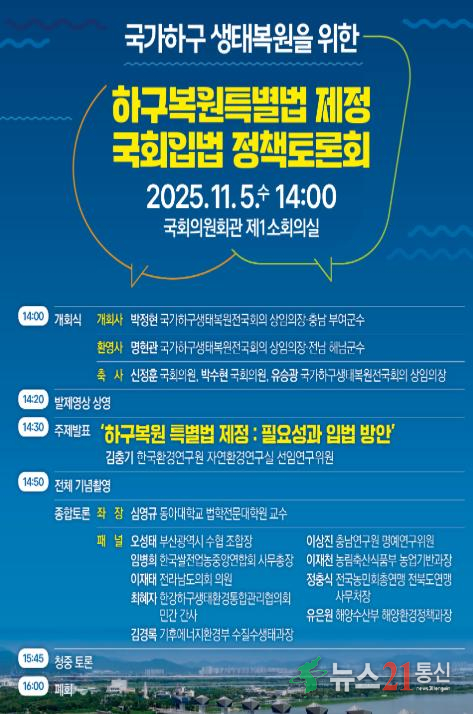 이날 토론회는 이번 이재명 정부 국정과제로 채택된 국가하구 생태복원을 뒷받침하기 위한 특별법에 대한 논의가 이뤄질 예정이다 .