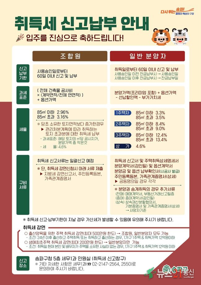 다가오는 잠실 일대 대규모 신축 아파트 입주에 대비해, 서울 송파구(구청장 서강석)가 이달 5일부터 아파트 조합원과 수분양자를 대상으로 취득세 자진신고 납부 안내문을 발송한다고 알렸다.