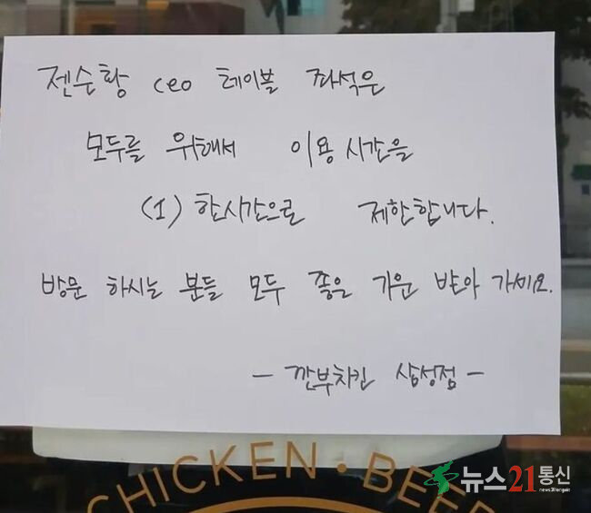 [뉴스21 통신=추현욱 ]서울 강남구 삼성동의 '깐부치킨' 매장 유리창에는 특별한 안내문이 붙었다. 젠슨 황 엔비디아 최고경영자(CEO)가 앉았던 자리를 차지하려는 경쟁이 치열해지자 해당 테이블에 1시간 이용제한을 둔 것이다.
