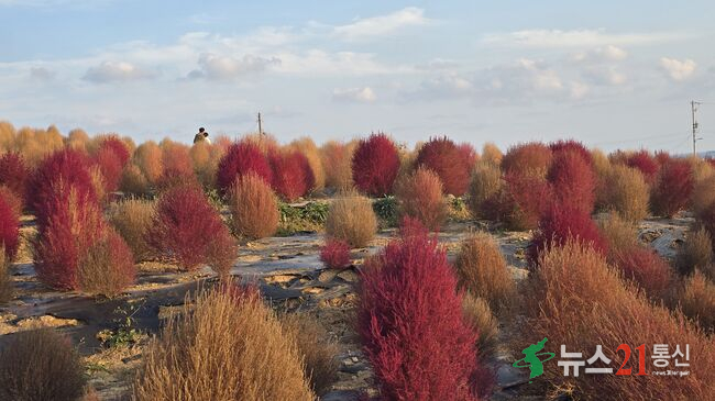 [뉴스21 통신=최세영 ] ▲ 사진=최세영 기자울산시 동구 대왕암공원과 슬도 사이에 위치한 ‘댑사리’ 일대가 가을을 맞아 붉은 코키아(댑싸리)와 황금빛 팜파스그라스로 물들며 시민과 관광객들에게 새로운 볼거리를 제공하고 있다고 5일 밝혔다.‘댑사리’는 울산 동구 대왕암공원과 슬도 등대를 잇는 해안길 중간 지점에 .